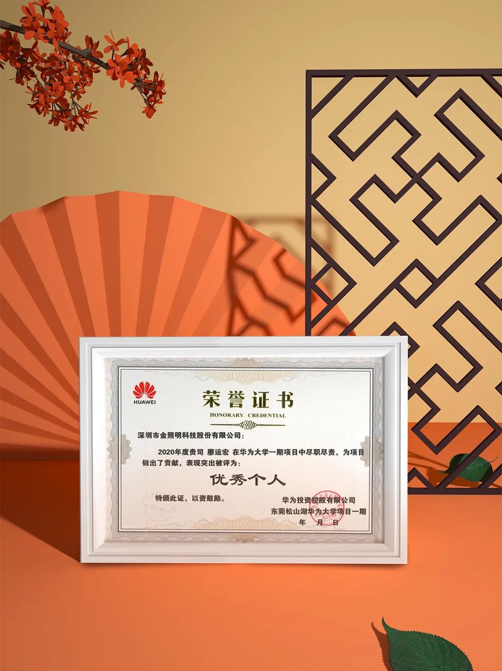 新年伊始,金照明收到了來自華為投資控股有限公司相關(guān)項目組的榮譽證書,表彰金照明員工在松山湖華為大學光環(huán)境建設(shè)以及華為溪村光環(huán)境建設(shè)兩大項目中做出的貢獻,并授予“優(yōu)秀團隊”與“優(yōu)秀個人”榮譽。