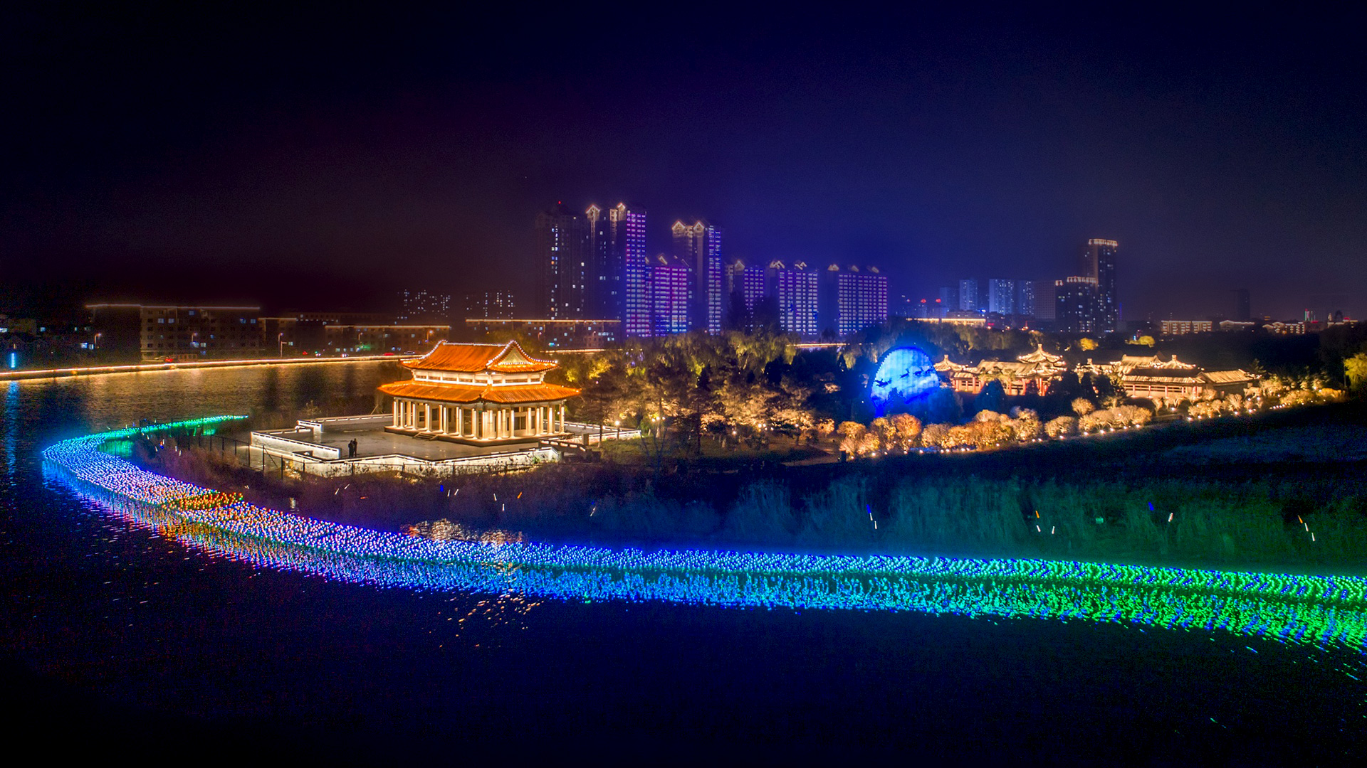 該項目位于我國重要石油、石化工業(yè)基地 - 遼寧盤錦,實施范圍包括盤錦市遼河濕地公園、向海大橋及遼河路橋、火車站及向海大道、湖濱公園及湖濱路、遼寧路、向海大道高架橋等眾多載體。項目用燈光描繪城市面貌和人文氣息,構(gòu)建盤錦全新城市夜景觀體系,打造新興工業(yè)旅游城市品牌形象。